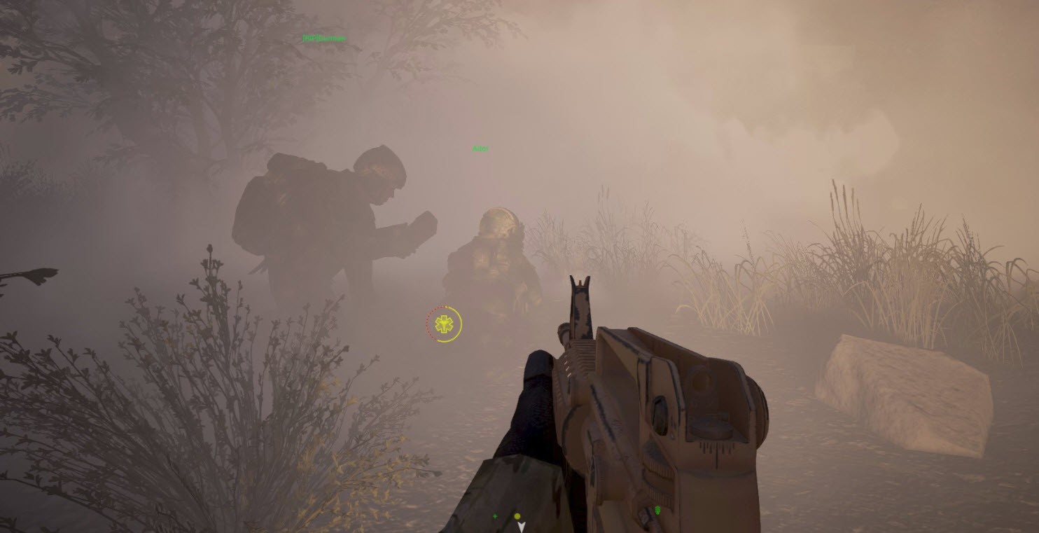 - Verwundet – reduziertes Leben anhand von Fall- oder Waffenbeschädigung. Wenn du verwundet bist wird deine Sicht schlechter (der Bildschirm verdunkelt sich). Nur Sanitäter können Wunden heilen. Sanitäter können auch sich selber heilen. Massiver Schaden kann unverzüglich zu Kampfunfähigkeit oder Tod führen.