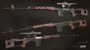 Das SVD-Gewehr wurde 1958 von Jewgeni Dragunow entworfen und 1963 von der Sowjetarmee und 1991 von den Russian Ground Forces übernommen. Dieses DMR ist sehr beliebt und wird hauptsächlich als Standard-DMR für Nachkriegspaktstaaten und Rebellen verwendet. Die SVD ist mit einem PSO-1-Zielfernrohr ausgestattet, das einen 4-fachen Zoom bietet, und verfügt über einen dünnen Lauf, eine Staubschutzkappe, ein Gas-Kolben-System, eine eiserne Visierung, einen Sicherheitshebel, einen Mündungsfeuerdämpfer und einen einzigartigen Holzschaft. Das Gewehr verwendet abnehmbare 10-Schuss-Magazine. Sie ist für 7,62x54mmR-Patronen geeignet.