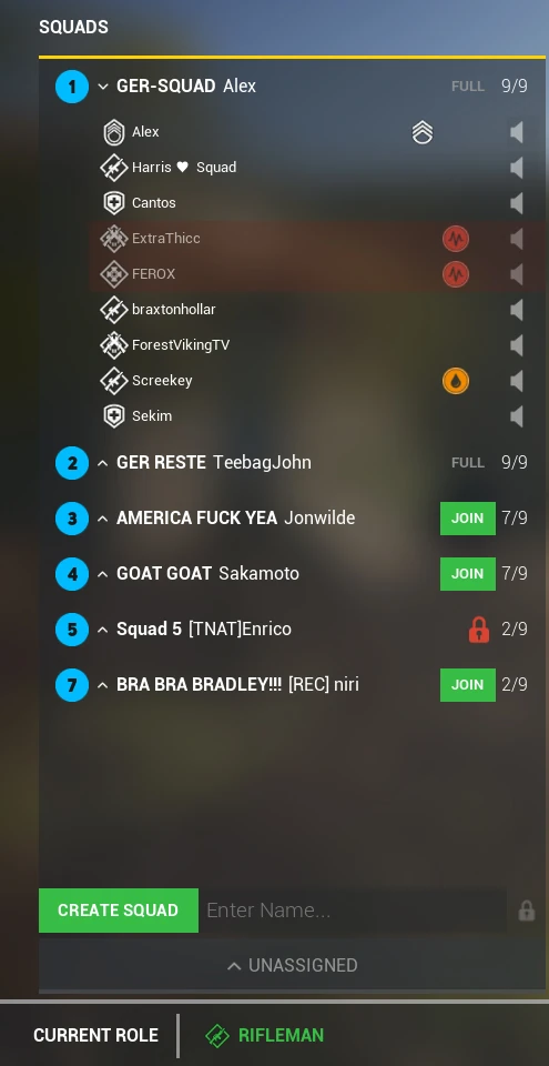 Um ein neues Squad zu erstellen, drücke die CREATE SQUAD-Taste oder benutze einen Hotkey. Dem Squad wird automatisch ein Name zugeteilt. Wenn du einen eigenem Namen für dein Squad haben willst, kannst du diesen vor dem Erstellen eingeben. Der Name sollte sinnvoll gewählt sein und wichtige Informationen enthalten, z.B.: GER MIC / Defense / Supply. Wenn du ein Squad erstellst, wirst du automatisch der Squad Leader (SL).