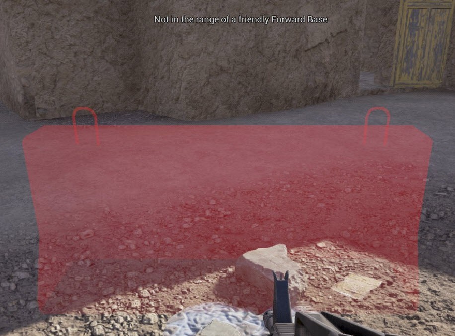 Nachdem das Radio gesetzt worden ist, die FOB Anzeige erscheint. Munition und Baupunkte beginnen bei 0. Logistik Fahrzeuge werden benötigt im die FOB mit diesen Punkten zu Versorgen. Die Status Anzeige unter dem Radio zeigt den Lebensstatus des Radios an. Die Munitionsanzeige, Links, zeigt den Munitionsstatus der FOB an.