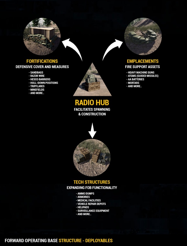 Bevor Strukturen gesetzt/gebaut werde können, muss der Squad Leader ein Radio Hub setzen. Sobald ein Radio Hub platziert und mit Baupunkten von einem Logistikfahrzeug oder Hubschrauber versorgt wurde, können im Umkreis von 150 Metern um den Funkknotenpunkt einsatzfähige Objekte gebaut werden. Der Squad Leader oder Fireteam Lead wählt die Stellungen aus dem Deployables Menu, indem er die Standardtaste T gedrückt hält. Sobald ein Einsatzmittel ausgewählt ist, kann es mit den Pfeiltasten gedreht werden.