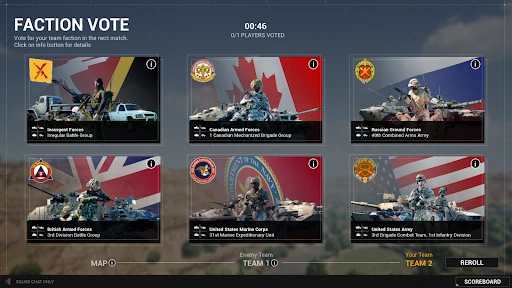 Das Abstimmungssystem (Votingsystem) erlaubt es den Spielern, für Fraktionen, Einheiten Aufstellungen und Kartenlayer am Ende jeder Runde. Die Mechanik wurde in Version 7.2 eingeführt.[1]