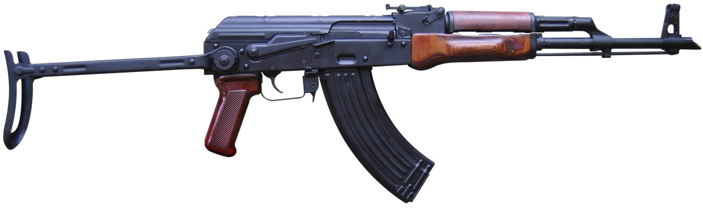 The AKMS is a long-stroke piston operated, rotating bolt assault rifle. The AKMS is a folding stock variant of Kalashnikov's AKM assault rifle. The AKMS has an under-folding metal shoulder stock, a slant-cut muzzle brake, a modified trigger assembly, improved iron sights, and a new gas block. Like its parent, the AKM, the AKMS uses 7.62x39 mm cartridges.