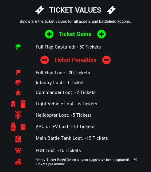 最先耗光所有票数的团队将会输掉比赛。因此,载具资产和前线作战基地(FOB)在票数中占据了举足轻重的地位。了解这些(载具)资产对应的票数有助于你准确分析一个队伍的状态。虽然保住了旗点但是丢掉了大量的资产仍然可能会导致你的团队在游戏中战败。