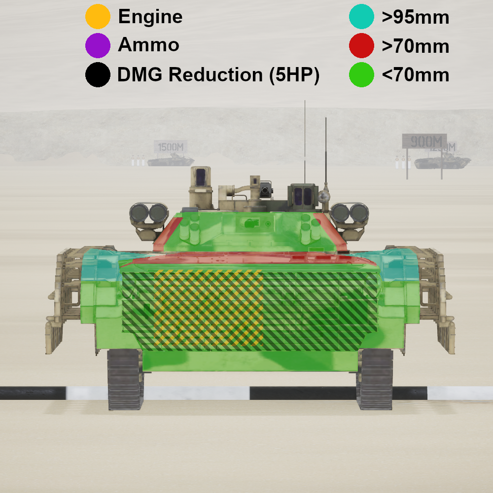 Protection map of "BMP-2M" at close range and neutral angle. Shooting from different angles will affect penetration chances. For reliable penetration at most angles aim for "<70mm". Ifv shooting older ammunition (GFI, MEI, IMF, "PLA") may only be able to penetrate "<70mm".