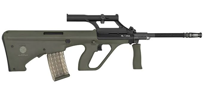 The F88 Austeyr is an Australian variant of the Austrian Steyr AUG A1 (a gas-operated rotating-bolt bullpup) license built by Lithgow Arms. Some modifications were made to suit Australian service. In 1985, it was selected by the ADF as the standard-issue rifle. The weapon notably features a 1.5x optic with a “donut-of-death” reticle, a foldable foregrip, and a single-shot lock-out button beneath the trigger.