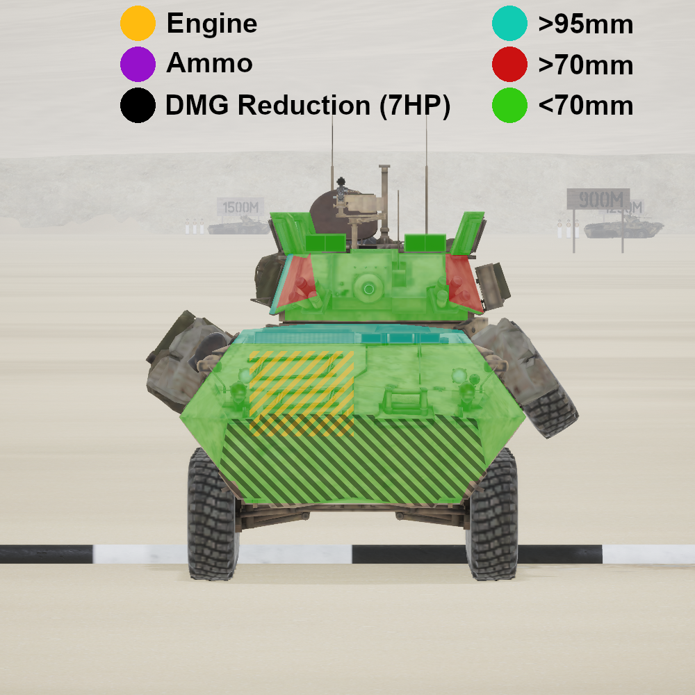 Protection map of "LAV-25" at close range and neutral angle. Shooting from different angles will affect penetration chances. For reliable penetration at most angles aim for "<70mm". Ifv shooting older ammunition (GFI, MEI, IMF, "PLA") may only be able to penetrate "<70mm".