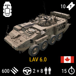 The LAV 6.0 is an infantry fighting vehicle featured in Squad. It was introduced in the Alpha 15.3 update with the Canadian Army.[1]