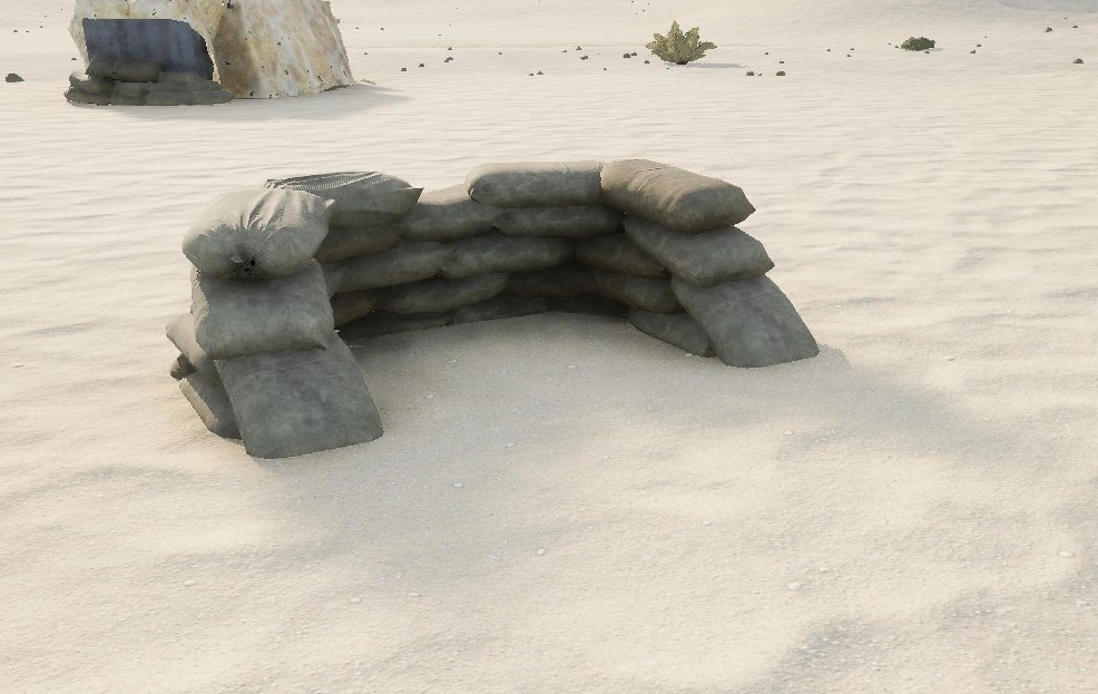 The sandbag comes in three forms. Sandbags are the only stackable deployable at the present. The pillbox has a camo-netting in front to block the view from the enemy.