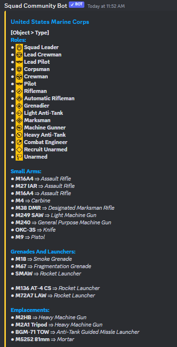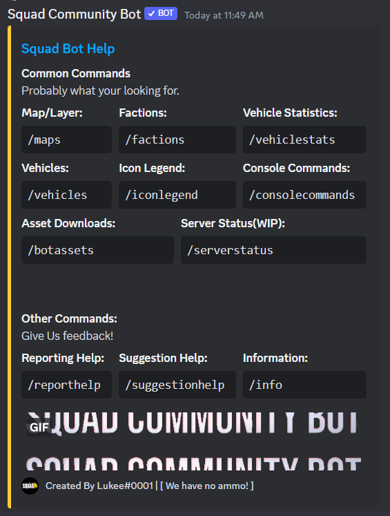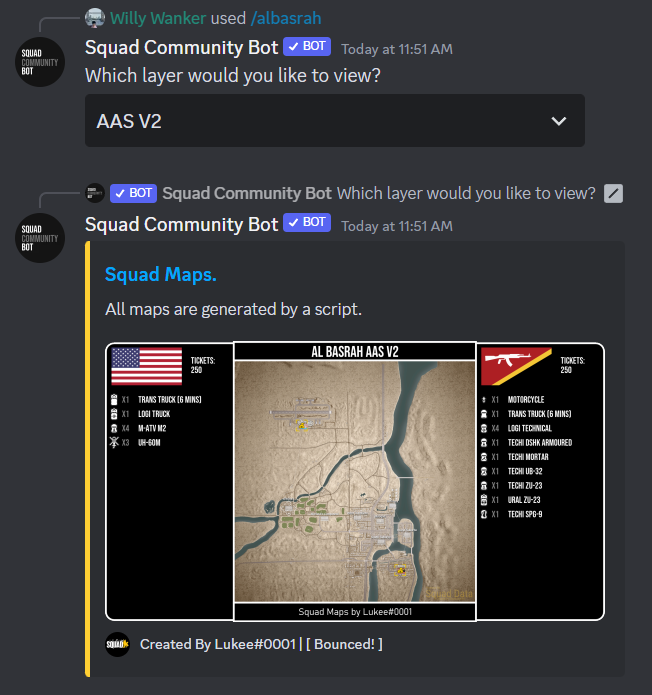 The Squad Community Bot is a Discord bot with a range of commands that provide detailed information about the game, including statistics on every vehicle, information on every map and its individual layers, statistics and information on each faction, and much more. All information is provided with a link to the Squad Wiki. The bot is free to use. The bot was developed by Lukee and Willy Wanker.