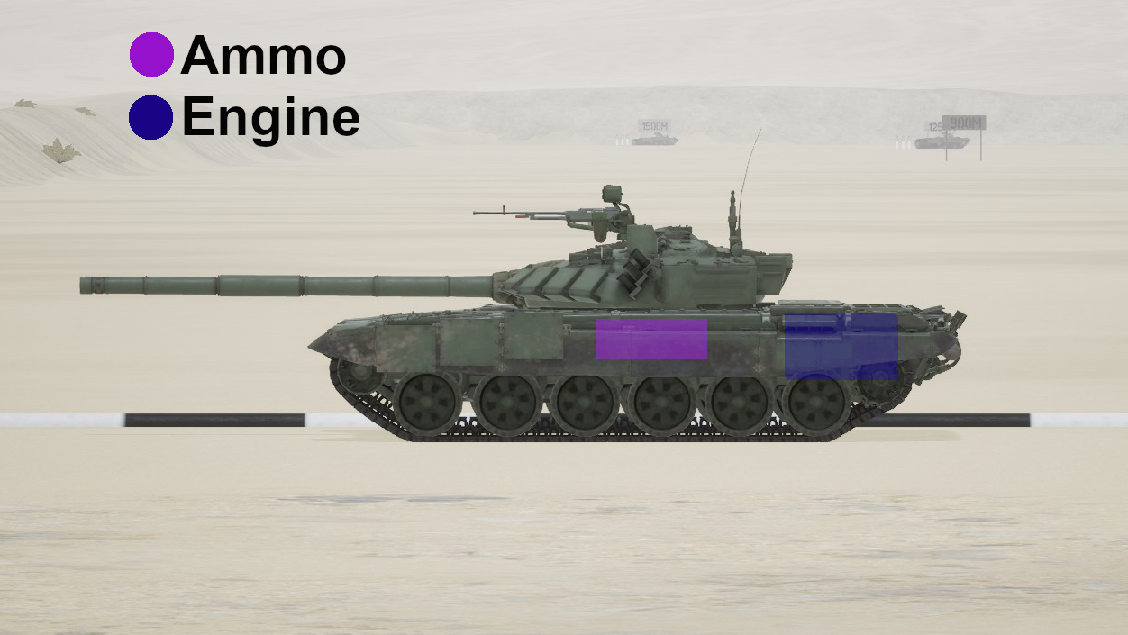 - The design of the turret makes the turret cheeks nearly invulnerable to anti-tank fire at any range. Similarly, the aggressively sloped upper front plate (UFP) of the tank makes the front hull difficult to penetrate if the T-72B3 is in a slightly elevated position. To ensure a successful penetration at all ranges, tankers should prioritize engaging the gun mantlet (where the gun meets the turret) and the lower glacis. At shorter engagement ranges, however, the UFP can be easily penetrated. A well-placed shot right below the driver's view port from the front will usually result in ammunition detonation.