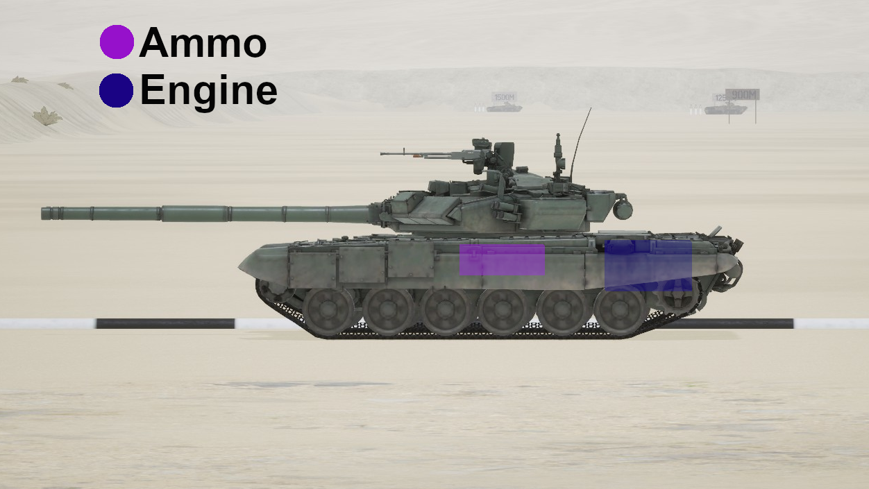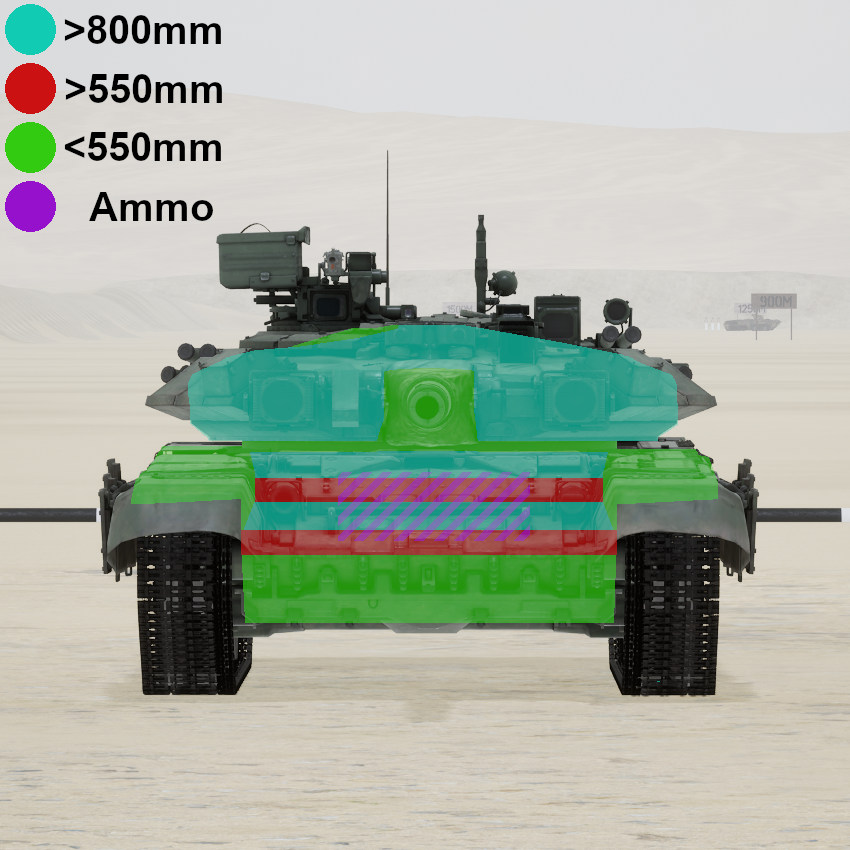 Protection map of "T-90A" at close range and neutral angle. Shooting from angles may affect armor values. For reliable penetration at most angles aim for "<550mm". T62 (115 mm cannon) can only penetrate "<550mm".