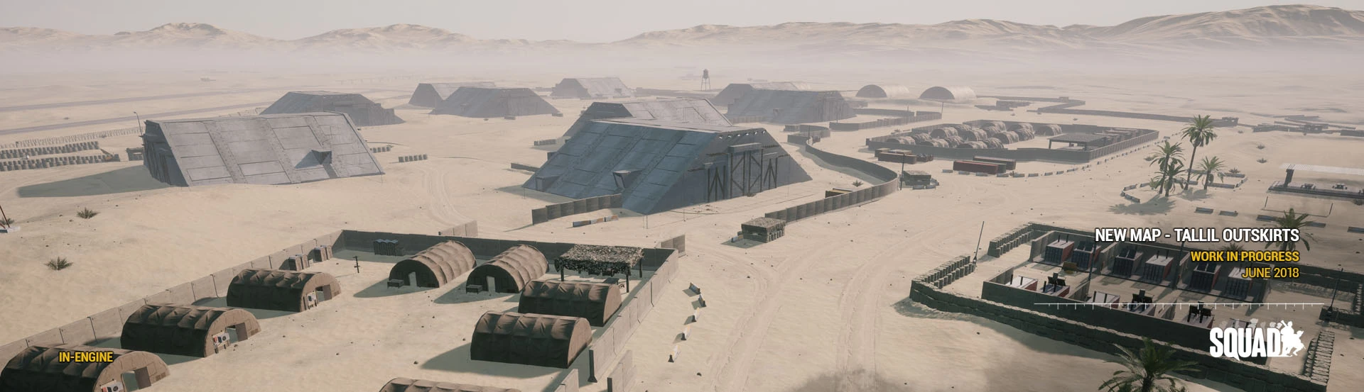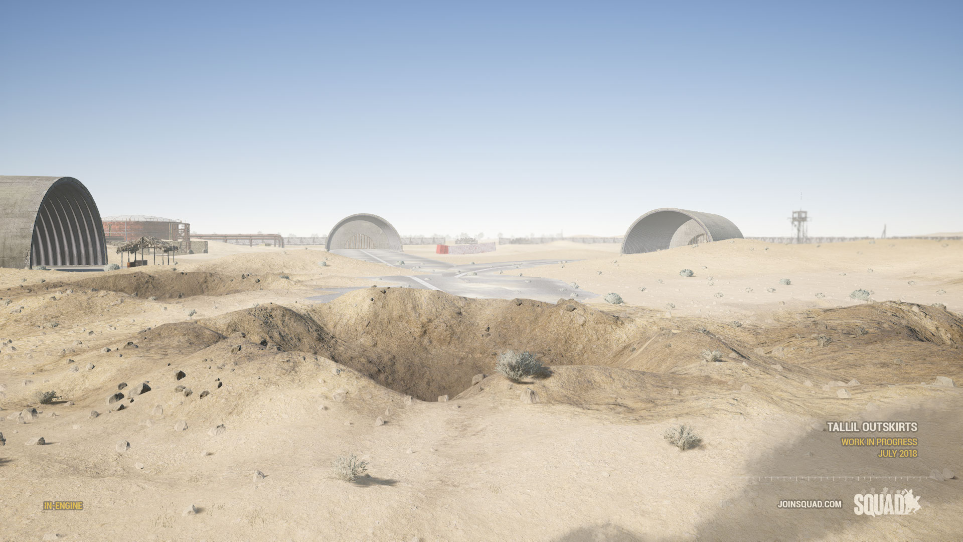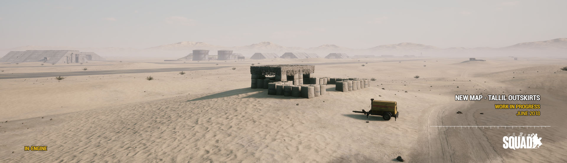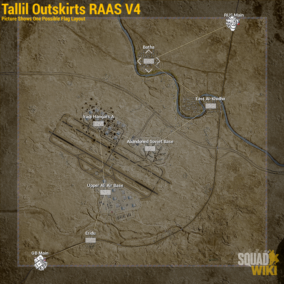 Tallil Outskirts (Arabic: "مشارف تلال") is a map in Squad. This map is based on Tallil Air Base and its historic role in the South Iraqi region during the 1980s Iran-Iraq war, the 1990s Gulf War, and as a joint Iraq-U.S. airfield today. The most predominant features are its massive aircraft bunkers and defensive positions surrounded by mostly open sandy desert, rocky outcrops, and villages. The map's focus is on vehicle-based combat, but infantry squads that work in conjunction with armored units will find great success on the battlefields of Tallil.
